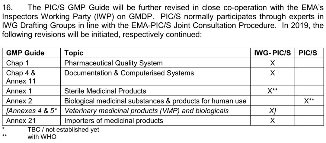 PIC/S将与EMA密切合作以修订PIC/S GMP指南。包括第一章《制药质量体系》、第四章和附录11《文件和计算机化系统》、附录1《无菌药品生产》、附录2《人用生物药物成分和产品》、附录4&5《兽用药物产品和生物制品》、附录21《药物产品进口》。
