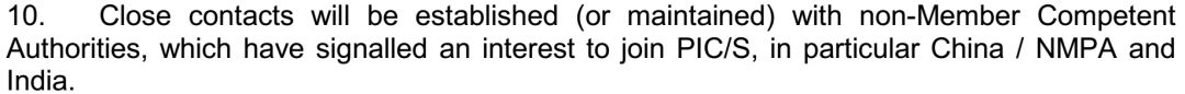 将与非成员主管当局建立 (或保持) 密切联系, 这些机构表示有兴趣加入PIC/S, 特别是中国/NMPA和印度。