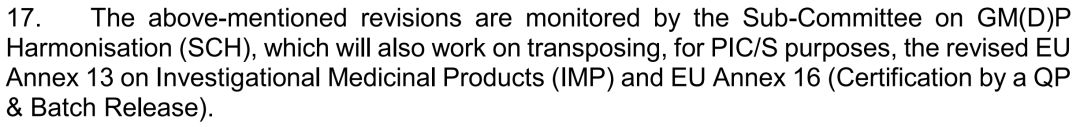 此外,PIC/S还将对欧盟GMP 附录13《临床试验用药》和附录16《QP认证和批放行》进行转化。