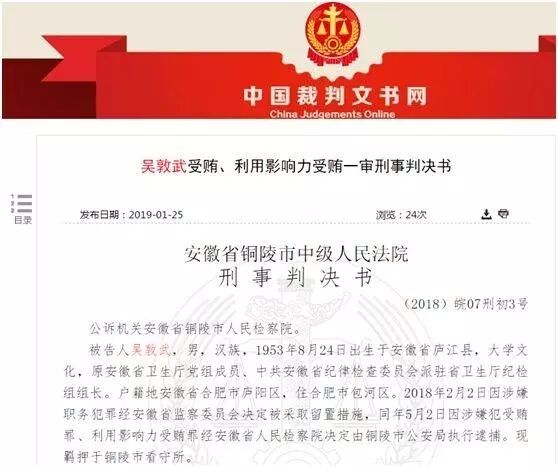 裁判文书披露:2012年底,被告人吴敦武担任原安徽省卫生厅党组成员、纪检组组长期间,接受天津红日药业股份有限公司华东区销售经理陆某和王某4的请托,为该公司药品中标价格上调事宜提供帮助。